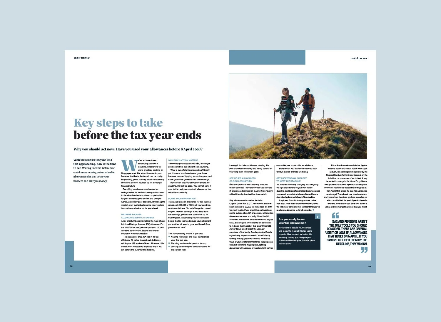 With the 2025/26 tax year-end approaching, now is the time to act to maximise your financial opportunities. Key priorities include using your £20,000 ISA allowance for tax-efficient growth and contributing up to £60,000 to your pension to take advantage of tax relief and long-term benefits. Other allowances, such as Capital Gains Tax, Dividend, and Junior ISAs, are "use it or lose it" opportunities. On page 08, we explain why early action avoids last-minute stress, secures tax savings, and ensures financial growth.